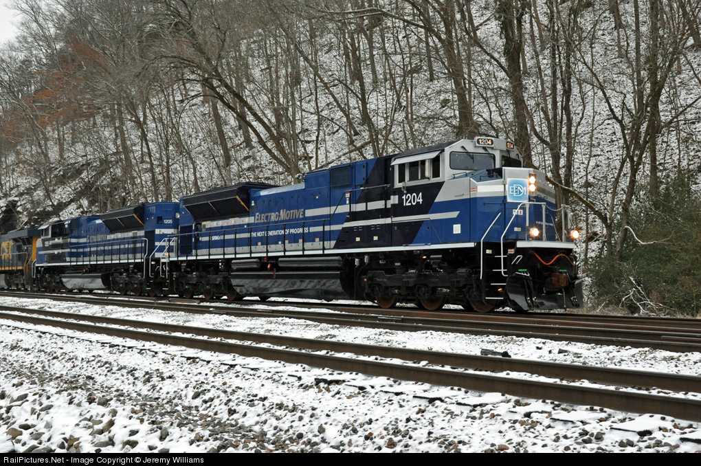 | On a cold, snowy day, EMDX 1204 eases through the south end of the Loyall Yard with empty GALX coal hoppers. It will soon receive a fresh crew and continue to Hilo to pick up a load of Black Diamonds. It's obvious, these clean units are making their first trip into the coalfields. Thanks to Ron Flanary for the heads up on these units! |