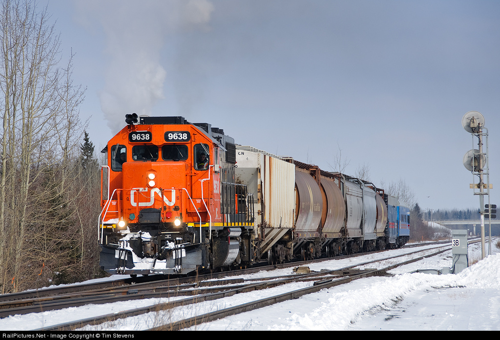 | I'll go out on a limb and say that this is the first time that an IC GP38-2 has lead a train across CN's Edson Sub. With that out of the way, IC GP38-2 9638 leads a strange looking "TEST" train west through the signals at Edson East. They'd stop in Edson to pick up two CWR cars and add them to the 6 grain cars that they picked up goodness knows where and continue testing towards Jasper. |