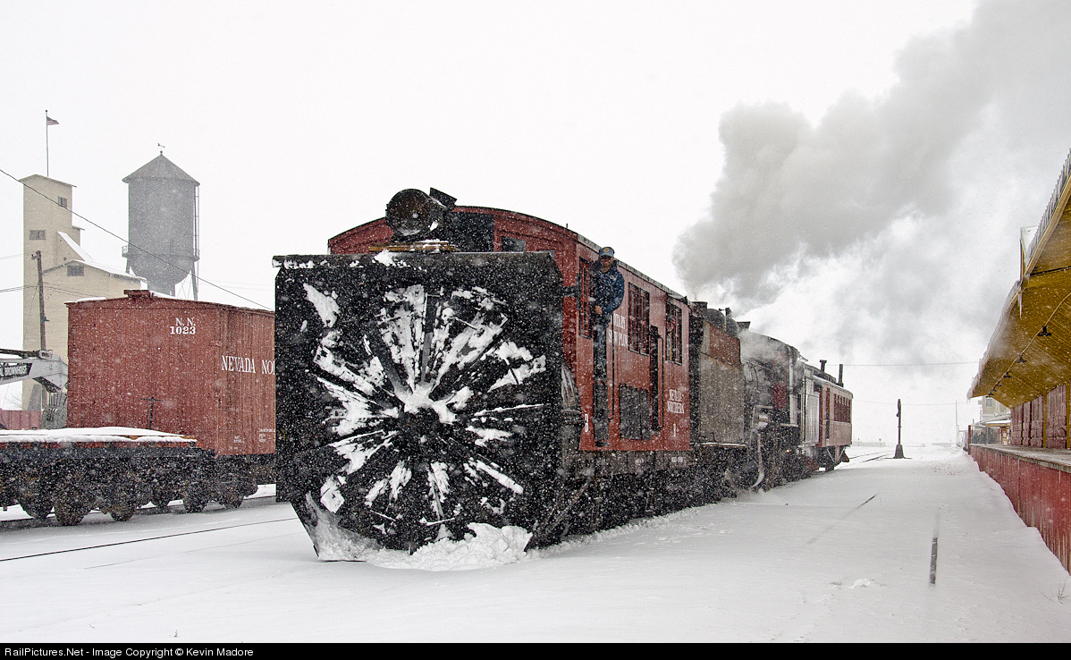 The snow train returns to Ely. Nevada Northern's Rotary Plow train steams past the old Ely Freight Terminal en route to the engine house, with her crew still manning their stations. Nevada Northern's Rotary B may not be operational, but you'd never know it from this photo. A recent cosmetic "face-lift" replaced most of the siding on the wooden cab, making her look more than fit for duty. With a few shovelfuls of snow splattered on her impeller blades, young crew member Anthony standing watch in the Pilot Door and beefy Consolidation #93 providing the motive power, the sight of this train in a snow storm is mighty convincing. About the only detail we could have hoped for was one of Pete Lerro's famous smoke bombs in the stack to breathe a little life into the rotary's engine.