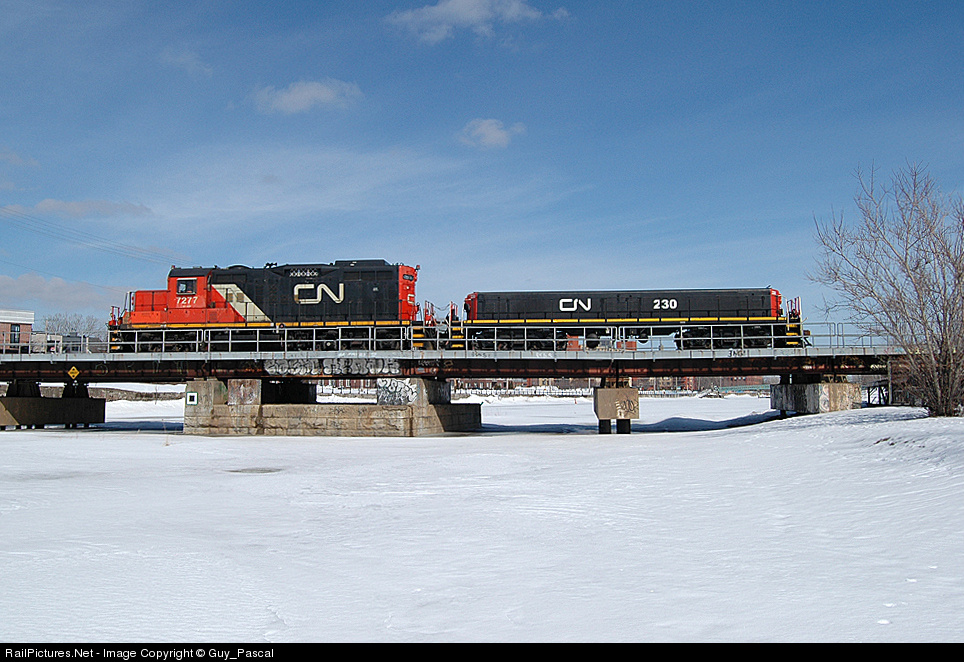 CN 7277 on Montreal sub,hauling it slug,numbered 230,over the bridge by a nice and sunny day
