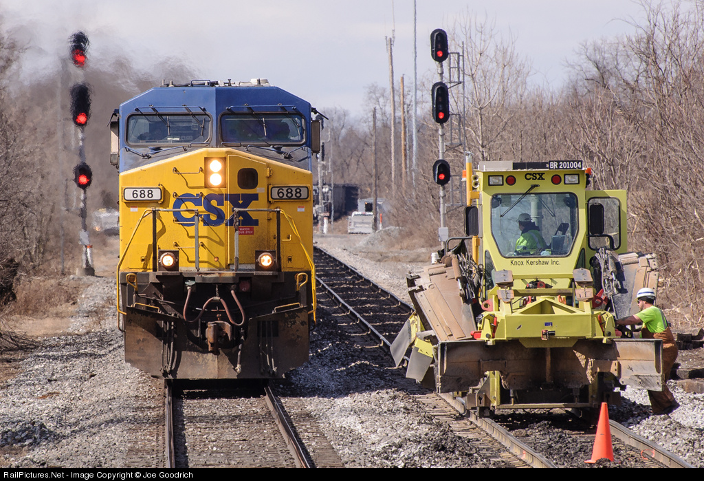 CSX 688 leads and eastbound empty hopper train past work equipment on the Westbound track at Shen