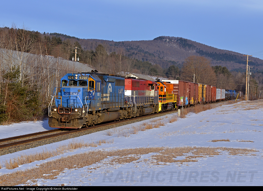 The first Genesee & Wyoming corporate image unit to move over the New England Central Railroad is seen on Sunday morning, March 10, when road freight train 324-10 heads into Sharon, Vermont, with NECR SD40 6281 (ex-Conrail), TP&W GP40-2W 4053 (RailAmerica paint) and the Connecticut Southern GP38 2021 (GWI paint and ex-NECR 3849). More shots of just the CSOR 2021 and detail photos are posted here: http://smu.gs/12G1CD9