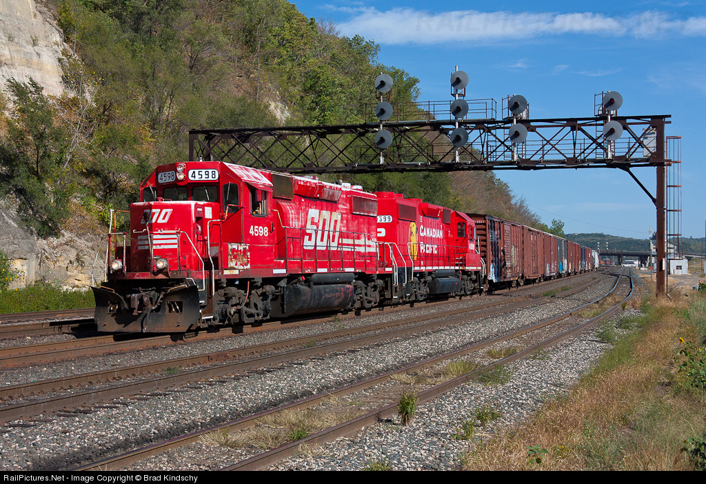 | With the Candy Apple Red paint looking a little weather worn, one of only 2 GP39s on the roster (both of Kennecott Copper heritage) leads CP H36-10 under the 5 track signal bridge at Dayton's Bluff. |