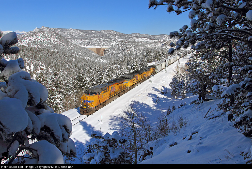 Working out of Crescent, Colorado, Union Pacific’s MNYRO (North Yard-Denver to Roper Yard-Salt Lake City manifest) passes by snow-covered trees on the morning of March 10, 2013. In the background is the 340-foot high Gross Reservoir Dam.