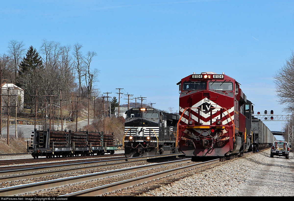 NS Heritage unit, Lehigh Valley and another AC unit cut off from a coal train while an empty coal train heads back to the coalfields for a refill.