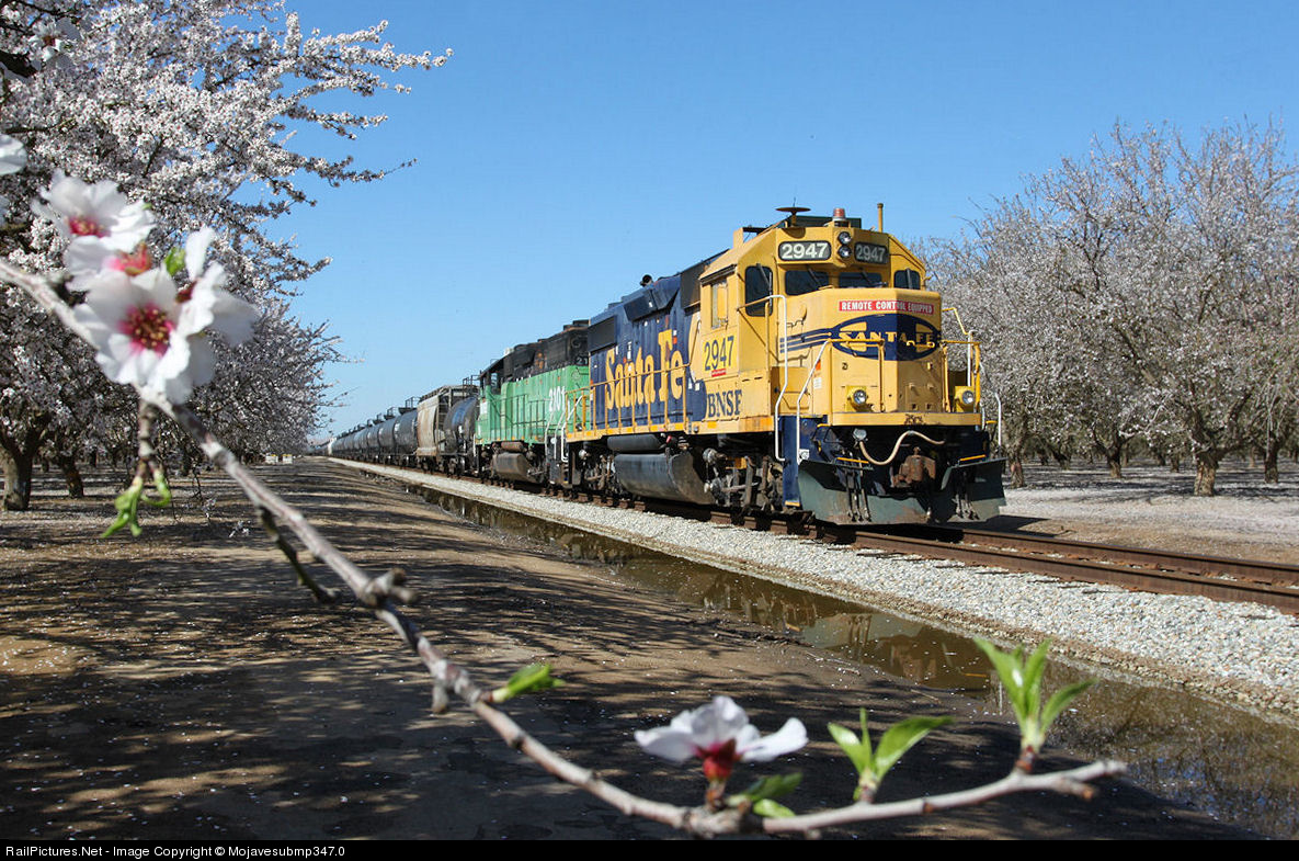 | What a perfect place to park a train! BNSF 2947 and it's train are tied down east of Shafter on the Lone Star industrial lead that runs through this beautiful Almond orchard. |