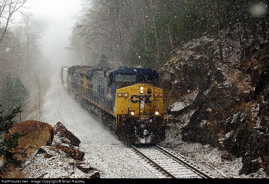 | CSX Q698-10 rolls south on the former Clinchfield during a brief snow squall. By the time the train reaches Thermal, about 25 miles ahead, it will be in bright sunshine. |
