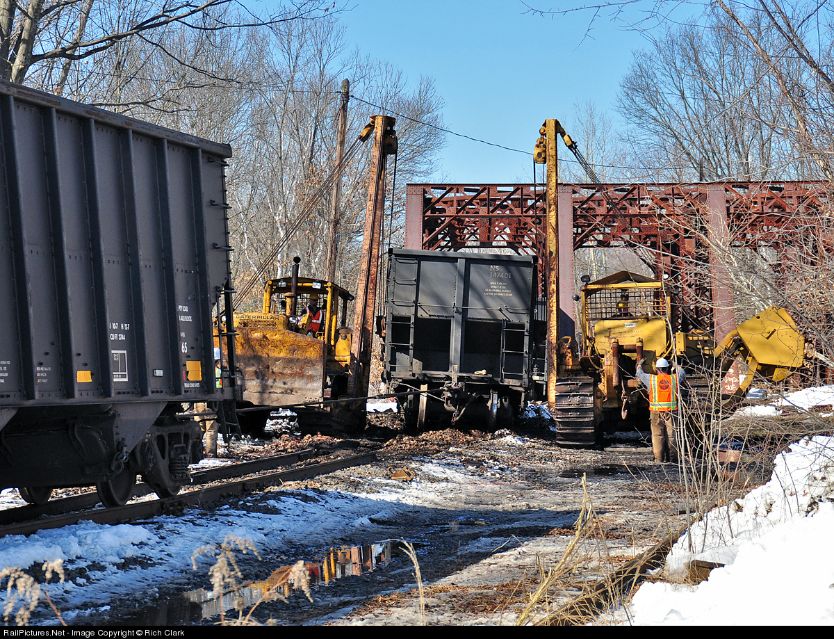 This is the sight two days after the derailment of at least 6 loaded coal cars bound for Bow, NH. There are two cars off the rails (rails all ripped apart and up) and two more on the bridge with the one in sight leaning against the upright and two more north of the bridge. Snow was around for two days and luckily warm weather was around for 2 days to help cleanup. The crews are using MEC 613 to pull the car towards the track while the sidewinder dozers keep the front trucks on the ground. It took several attempts as the engine couldn't budge the car at first but then did get it to the rails and rerail two cars this way before tackling the much harder cars on the bridge. The trucks were chained to the underside of the loaded cars to not allow them to fall out and there was at least one NS person on site to keep an watchful eye on things. It's amazing how much those winches can pick up as these were fully loaded cars at around 110-115 tons gross each car.