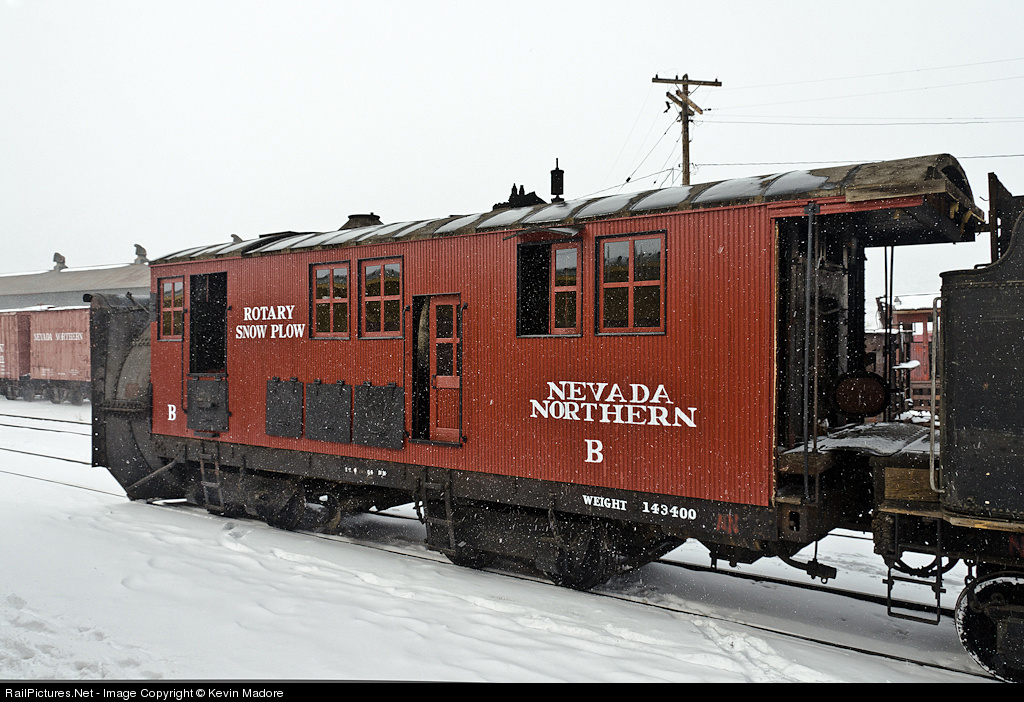 Rotary 101. Here's a rear-quarter view of Nevada Northern's 1907-vintage Rotary Snow Plow B. It's a slightly different look at this classic piece of MOW equipment than you typically see, and it gives you a little better view of the overall configuration of the machine. As the lettering on the side indicates, this critter weighs in at 143,400 lbs...which is on a par with the weight of a locomotive. Although it incorporates a steam boiler, it is not self-propelled. The boiler only provides power for the rotary impeller blades up front. The plow requires one or more steam locomotives to push it, depending on the depth and density of the snow, as well as the grade being cleared. The rotary is crewed by a minimum of 3 people, and often by as many as 5 or 6. A Fireman manages the fire and water levels in the boiler. He stands on the footplate between the tender and the rotary and shovels coal into the firebox. His injector controls are located inside the cab, behind the rear set of windows. The Engineer sits on the right side of the boiler. He controls the speed, power and blade bite on the impeller. The deckless nature of this cab makes it very difficult for the Engineer and Fireman to see and communicate with each other, particularly when the Fireman is on his seat. The other required crew member is the Pilot, who stands up in the pilot house up front. He may be assisted by one or more extra crew members, who may be mechanics or additional observers. The Pilot watches the track, the snow depth and the rotary's progress. He controls the direction of the discharge chute as well as the steam jets inside the intake, which are used to keep snow from caking on the impeller blades. He also controls the raising and lowering of the flanger blades. He and his assistants will use hand and whistle signals to communicate with the pusher engine crews, telling them to speed up, slow down, stop or reverse. Running this type of plow is clearly a team sport, and the Rotary Pilot is definitely the "quarterback" of the crew.