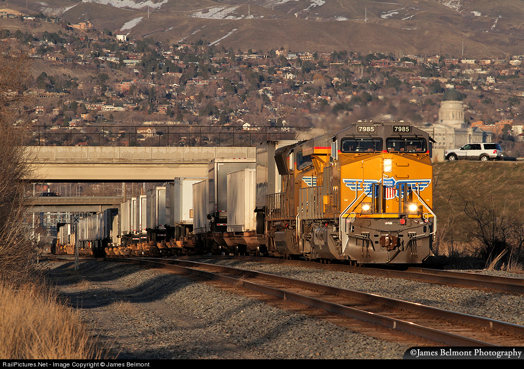 | Union Pacific's hot ZDVSC ducks under Redwood Road while ascending a short 0.49% climb to CP Orange Street just west of downtown Salt Lake City. The five story Utah State Capitol building which opened on Dec. 26, 1912, is visible through UP 7985's exhaust. Architect Richard K.A. Kletting designed the structure in Corinthian Neoclassical style. |