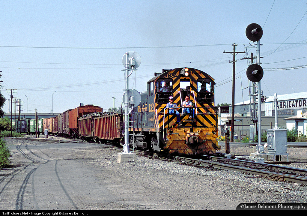 Rio Grande's 'Short Line Transfer' from Roper Yard moves a lengthy cut of cars through Grant Tower, bound for UP North Yard in Salt Lake City. Most of the elements that make up this 1987 photograph are gone today at 6th West and South Temple Streets, including the four man crew working this inner city transfer.