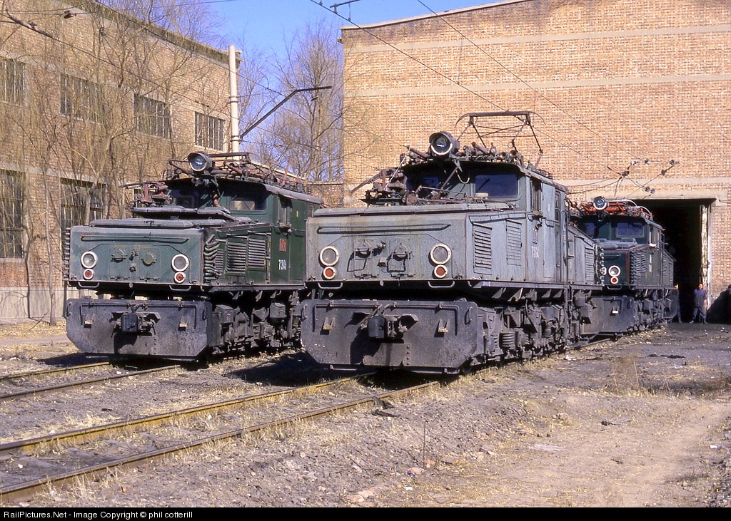 3 East German built LEW BoBo locos stand outside the loco shed at Pingzhuang. These are part of a large fleet of similar locos that work the huge open cast colliery at Pingzhuang.