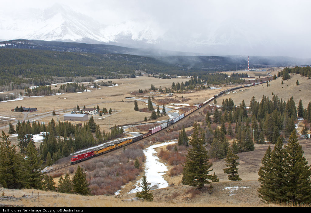 | Crowsnest Pass: An eastbound Canadian Pacific manifest freight rolls down the eastern slope of Crowsnest Pass on the British Columbia - Alberta border. The train is about to enter the community of Coleman, which was once an important mining center. March 16, 2013. |