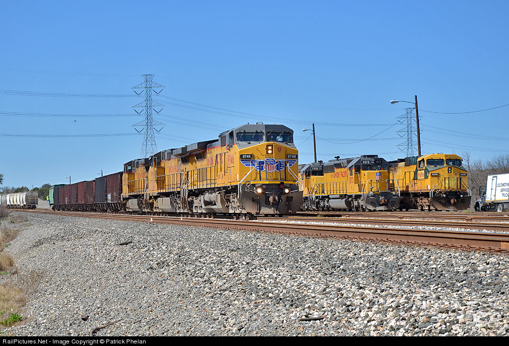 Some highly appropriate UP power gathers at the small yard on the ex-MP Corbyn Yard outside of New Braunfels, TX on a sunny Sunday afternoon. The UP 9746 is switching cars out to deliver to local cement plans while the SD40N and the patched C&NW widecab wait for the call to duty on Monday morning.