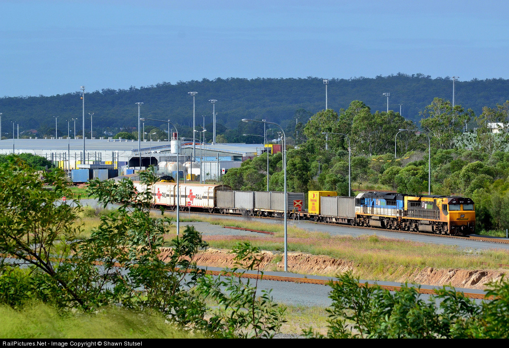 Aurizon/QR National's LDP007 and LDP003 await for crew, seen at Acacia Ridge Yards, Brisbane with 4BM7, Intermodal Service to Melbourne..