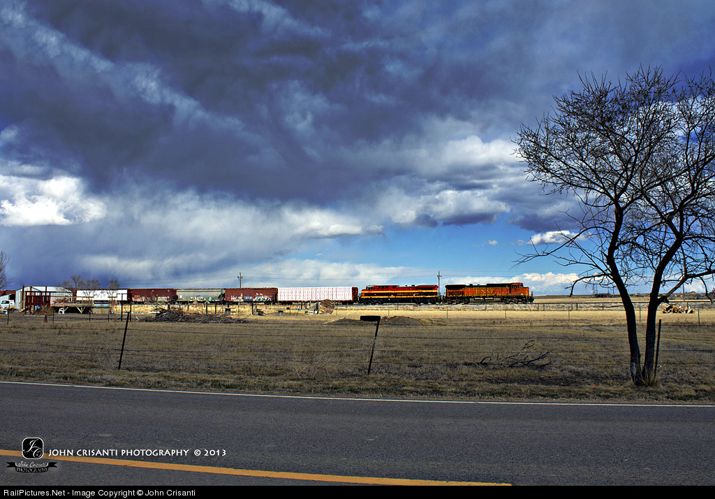| Scattered showers roam the area as the LAUDEN pause at the SSS Longs Peak waiting for a new track warrant to proceed south. Trailing behind the BNSF Dash 9 is a repainted Kansas City Southern GE AC4400CW that is painted in the Retro Southern Belle scheme. |