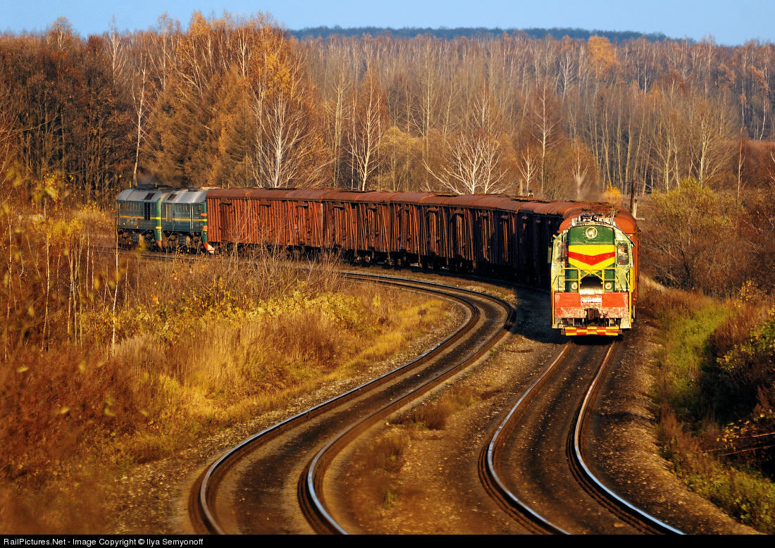 Late autumn sunset... 2M62 and ChME3 (in the tail) transport out of use cars on Uzlovaya - Ozherelye district. It's the south of Moscow region bordered by Tula region. This place is very popular with Moscow railfans...