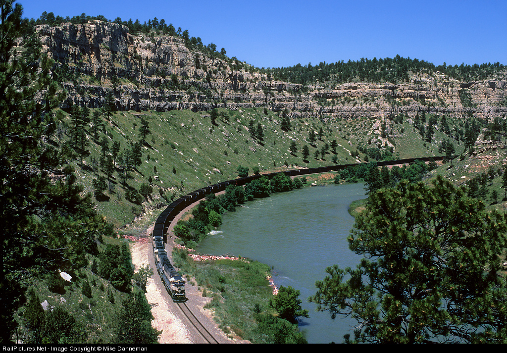 Three Burlington Northern SD70MACs pull a BNSF coal train through Wendover Canyon east of Cassa, Wyoming, on July 9, 1999. This location is on the scenic BNSF Canyon Subdivision along the North Platte River west of Guernsey, Wyoming.