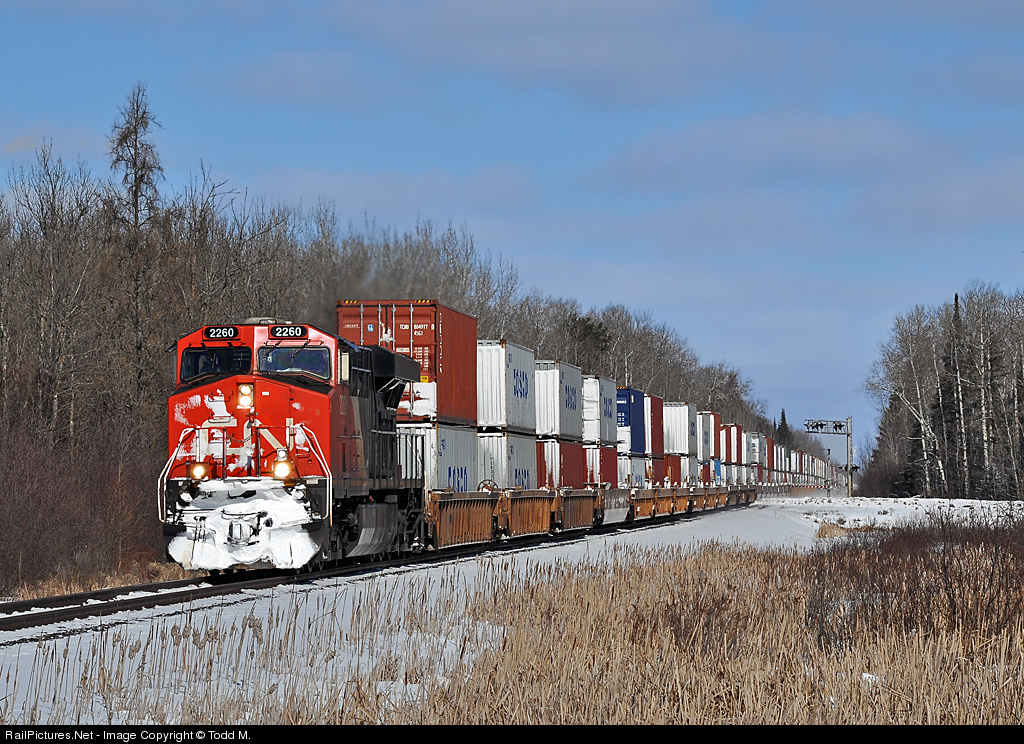| A single unit up front and a DPU unit on the rear with fairly close to two miles of containers in the middle as Q-116 rolls southbound down the CN Rainy Sub on a clear late winter's morning |