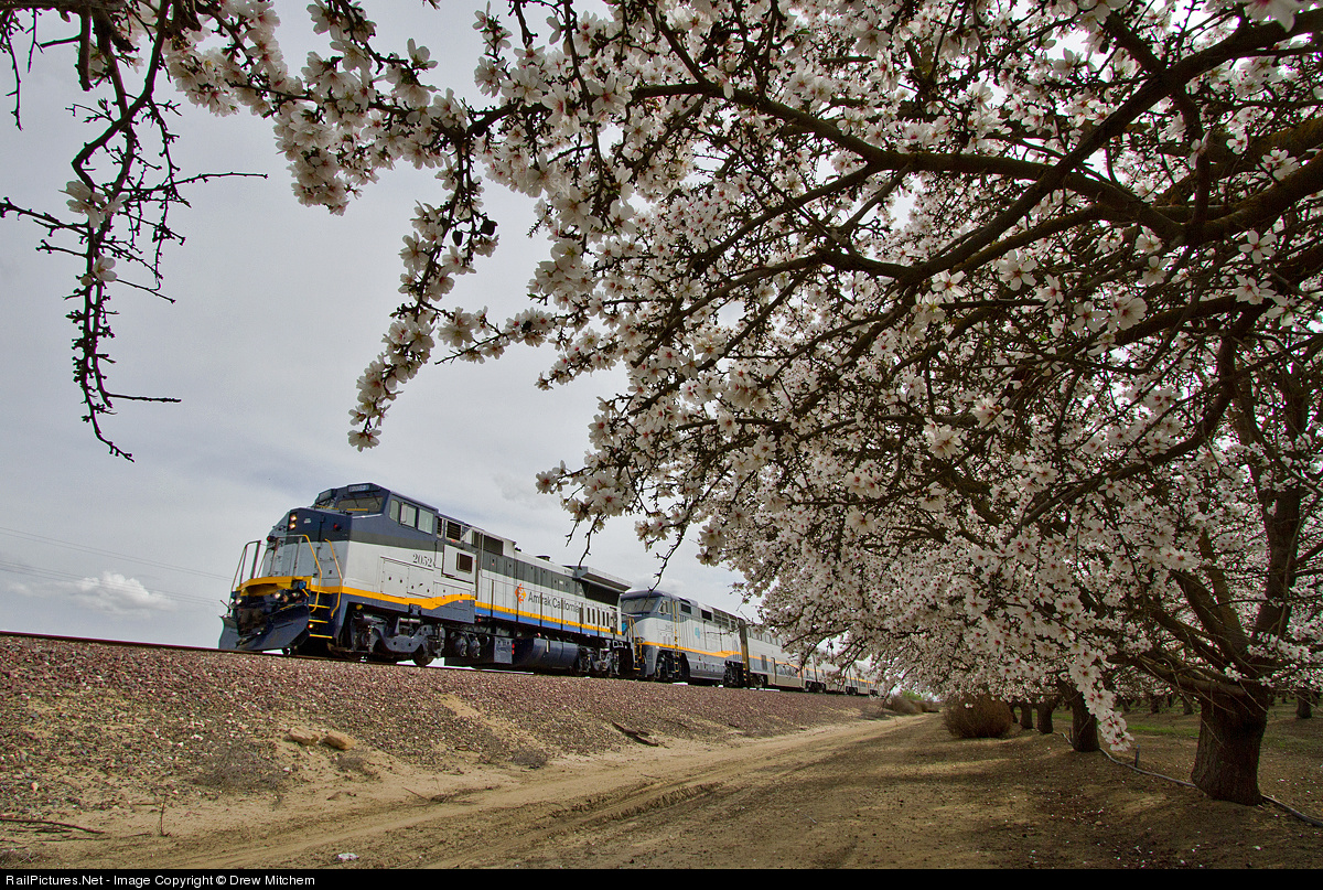 With a thick smell of pollination and the sound of numerous bees buzzing overhead, Amtrak train #715 passes one of the many orchards it would pass on its route towards the Bay Area after making its station stop in Wasco, as seen near Elmo siding on the BNSF Bakersfield Sub on 3/7/13. This shot was taken at 10mm. I made sure not to disturb the tree above, as I would have certainly got stung by one of the many bees pollinating the blossoms above.