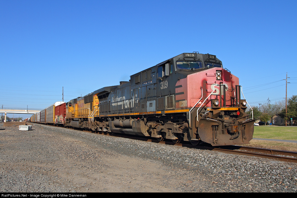 Southern Pacific AC4400CW No. 319 looks a bit battle worn as it leads an eastbound Union Pacific freight train on the Sunset Route through Rosenberg, Texas, on March 15, 2013. Reportedly, it is one of only 11 of the former SP AC4400CWs that is not yet patched and renumbered on the Union Pacific system. The era of seeing SP locomotives is almost over…