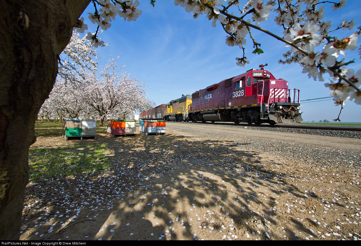 | The northern end of the San Joaquin Valley is alive as UP's Tidewater Local passes by one of the many orchards of blossoming almond trees and bee boxes full of bees pollinating them on a beautiful late winter morning, seen here on March 10, 2013. The smell of the blossoms and the sounds of the bees buzzing above was an experience I will never forget during this once a year spectacle that mother nature puts on in this part of the valley. This photo is in the July 2013 Trains Magazine, Page 74(Gallery Section). |