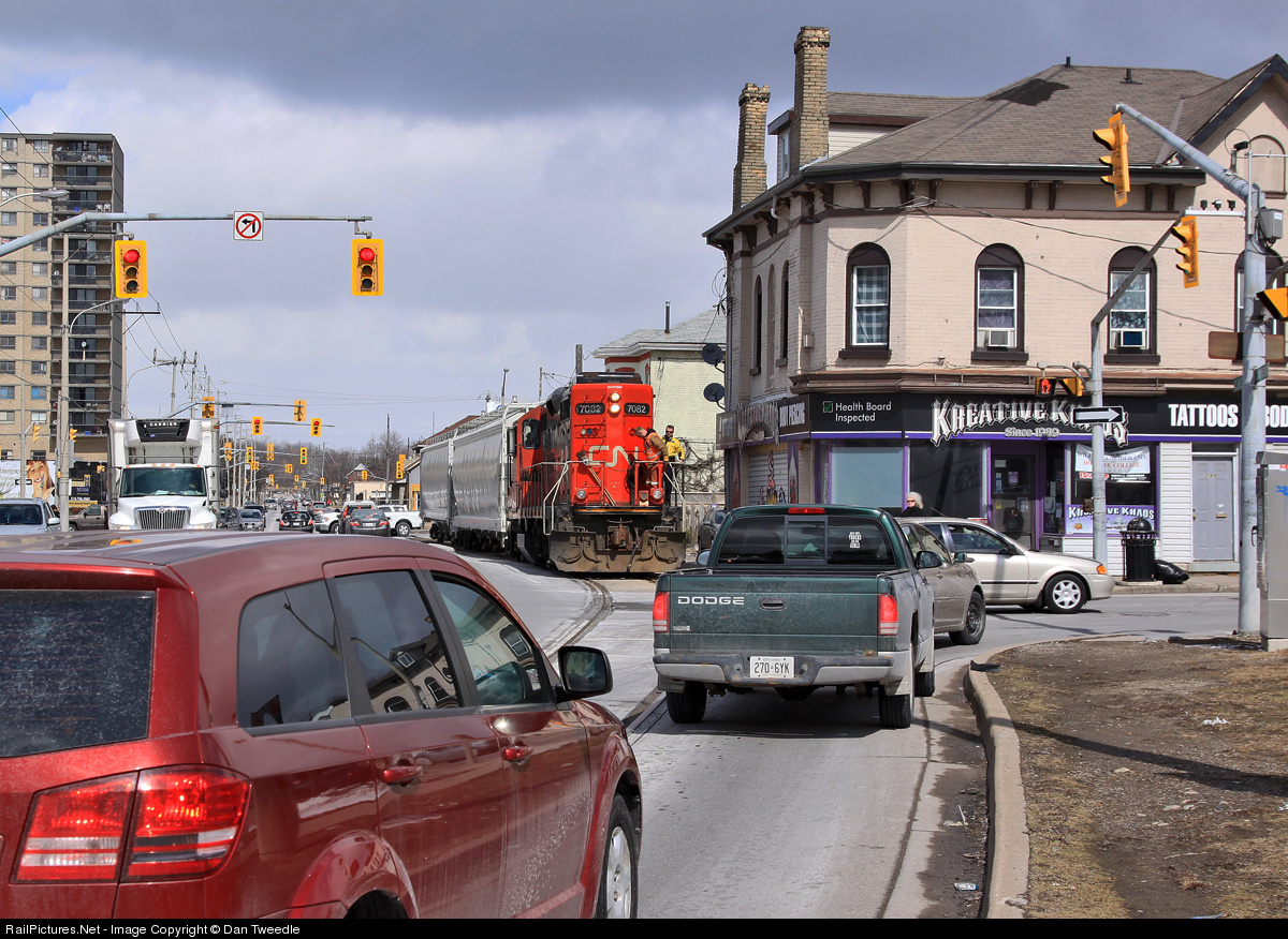 | CN no. 580 pauses at the corner of Clarence and Colborne Streets in Brantford, Ontario while the conductor activates the streetlights to stop opposing vehicular traffic at the intersection. |