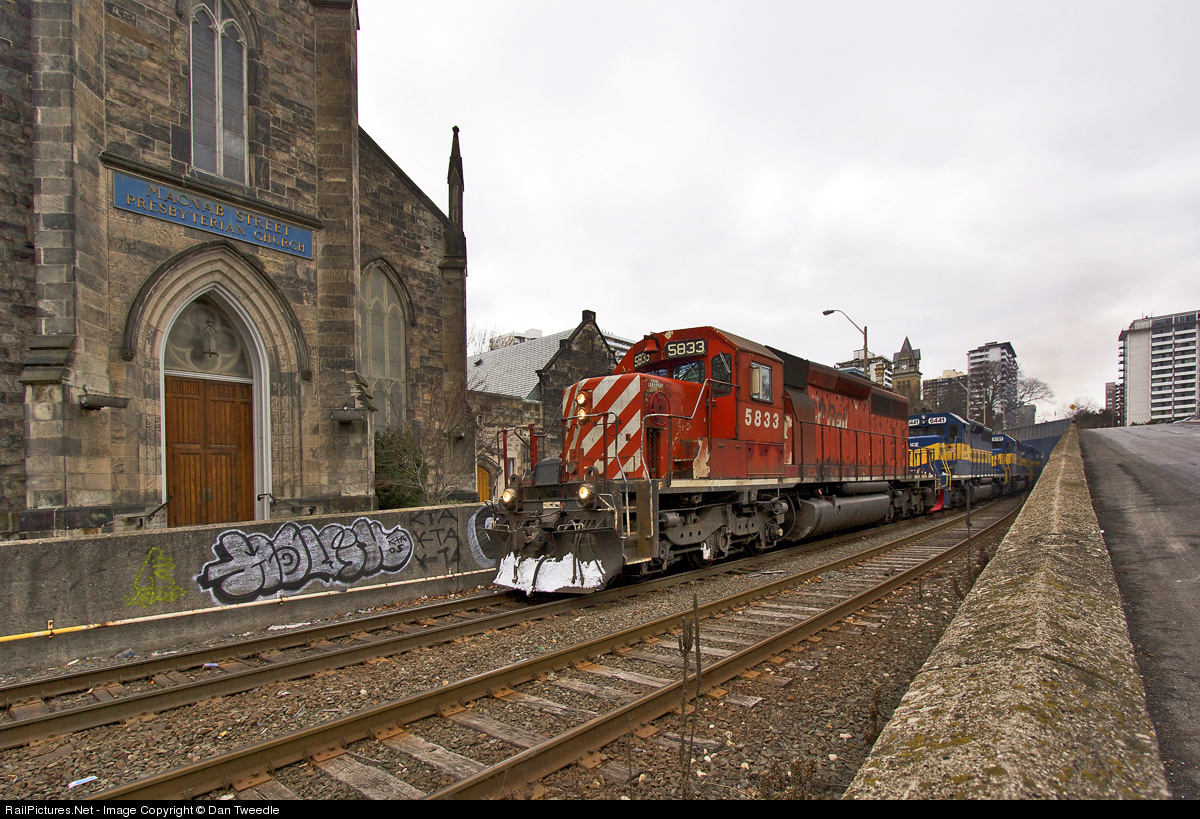 | CP 640-025 passes through the Hunter Street tunnel in downtown Hamilton, Ontario. One of the lesser documented points of the Hamilton Subdivision, it was created in 1895 by the TH&B and was double tracked. With the creation of larger freight equipment, it was decreased to one track and now sees daily GO service during peak hours. |