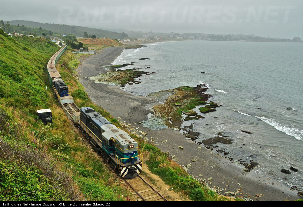 The train 50.554 loaded with cellulose, after crossing the tunnel No. 2, is touring the Playa Negra, in the town of Coronel, bordering the "Golfo de Arauco".
