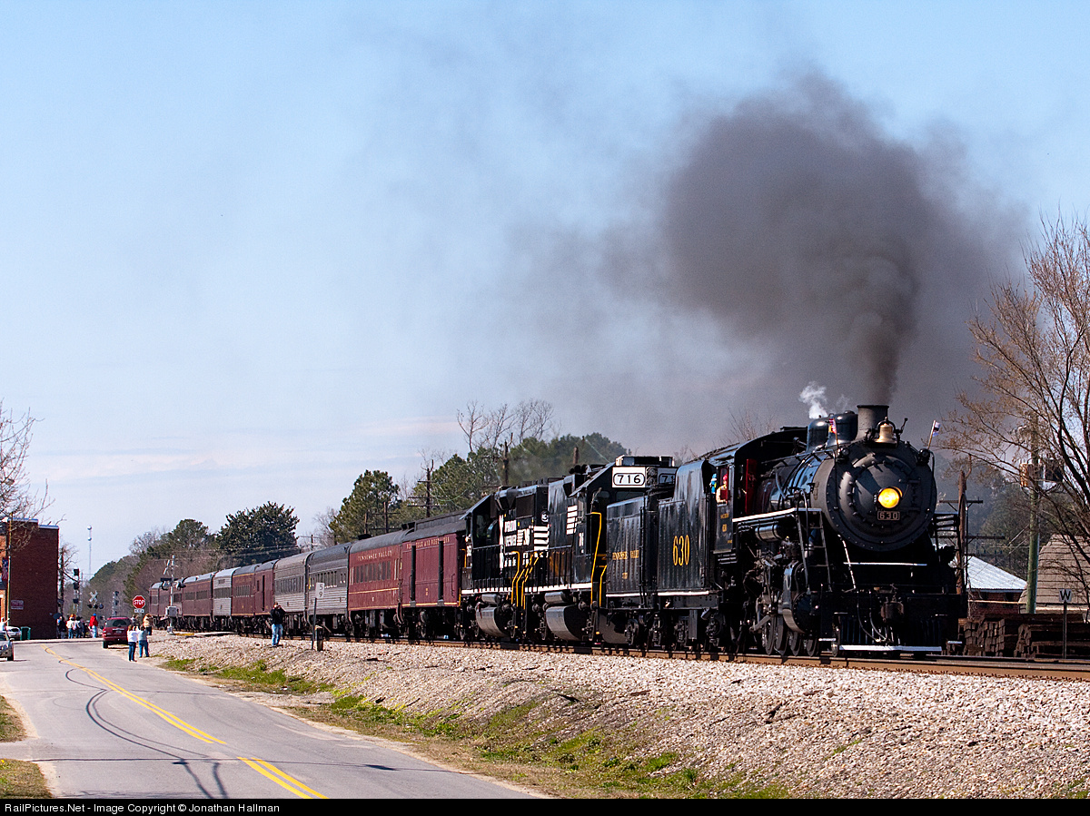 | Ex-Southern Consolidation #630 leads a 21st Century Steam excursion on the return from Petersburg to Norfolk, Virginia along the ex-N&W mainline. The train is seen here passing through Waverly. |