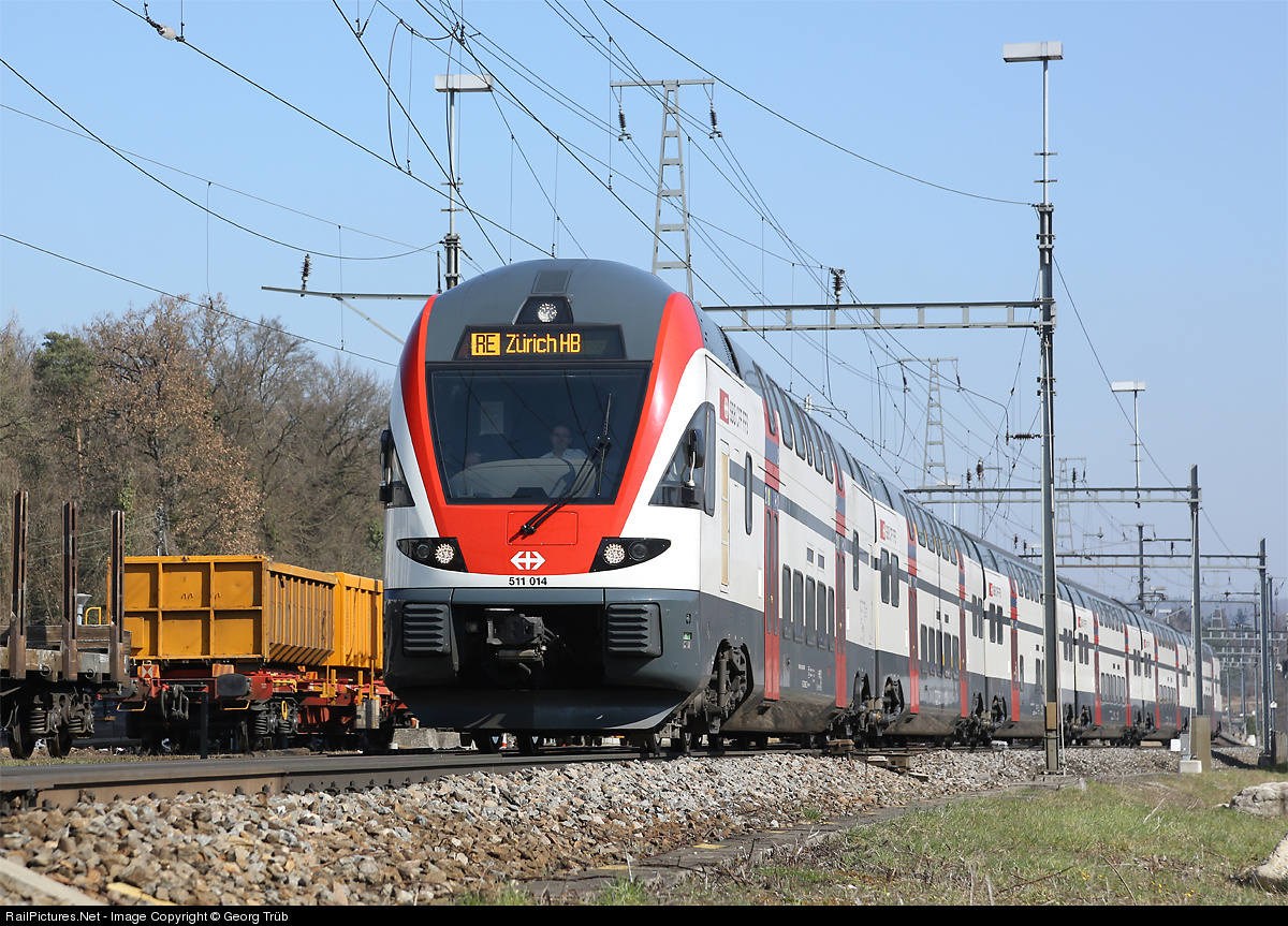 | The new RegioExpress between Schaffhausen and Zürich with stops in Bülach and Zürich Oerlikon are served by the new Stadler doubledeck "RVD" (Regional traffic doubledecker) RABe 511. # 511 014 is running the RE 3769 through Hüntwangen-Wil station. |