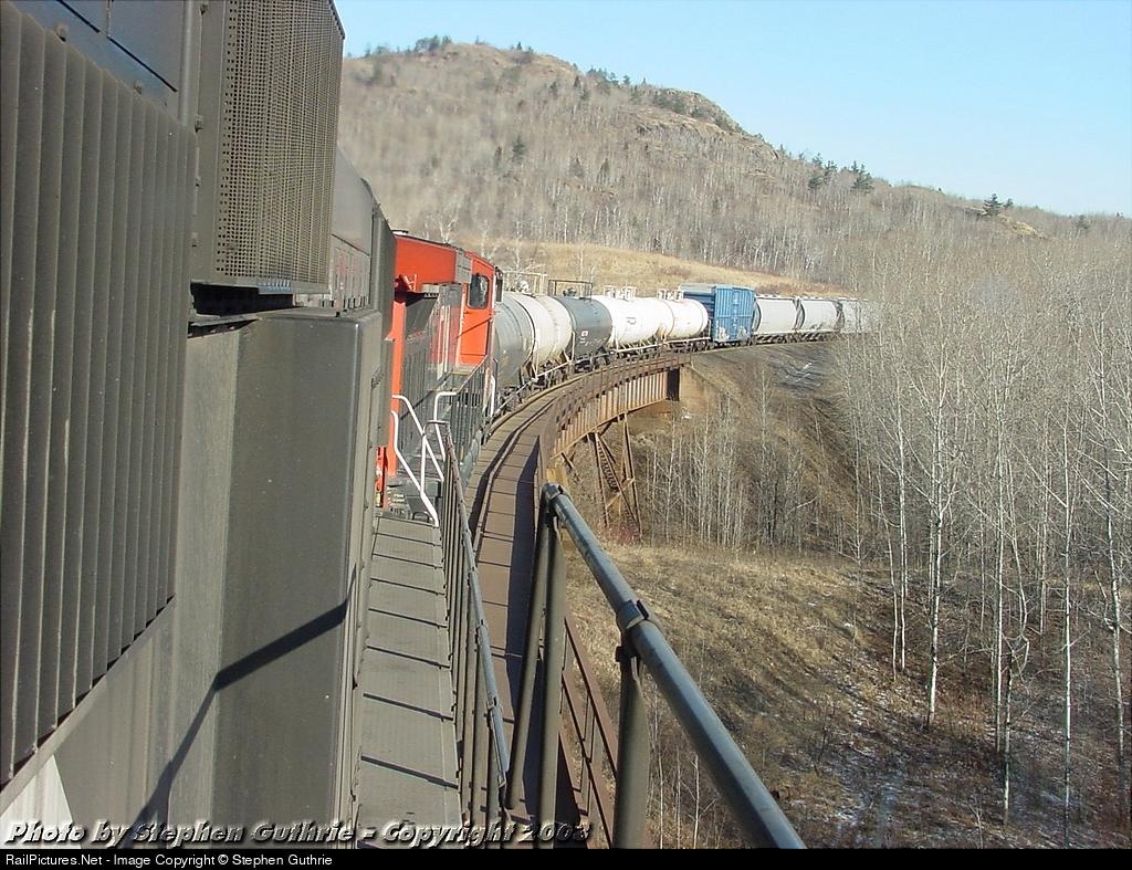 The view looking back on M34391-23 as it crosses the curved bridge on it's way up the hill to Noepeming Jct.
