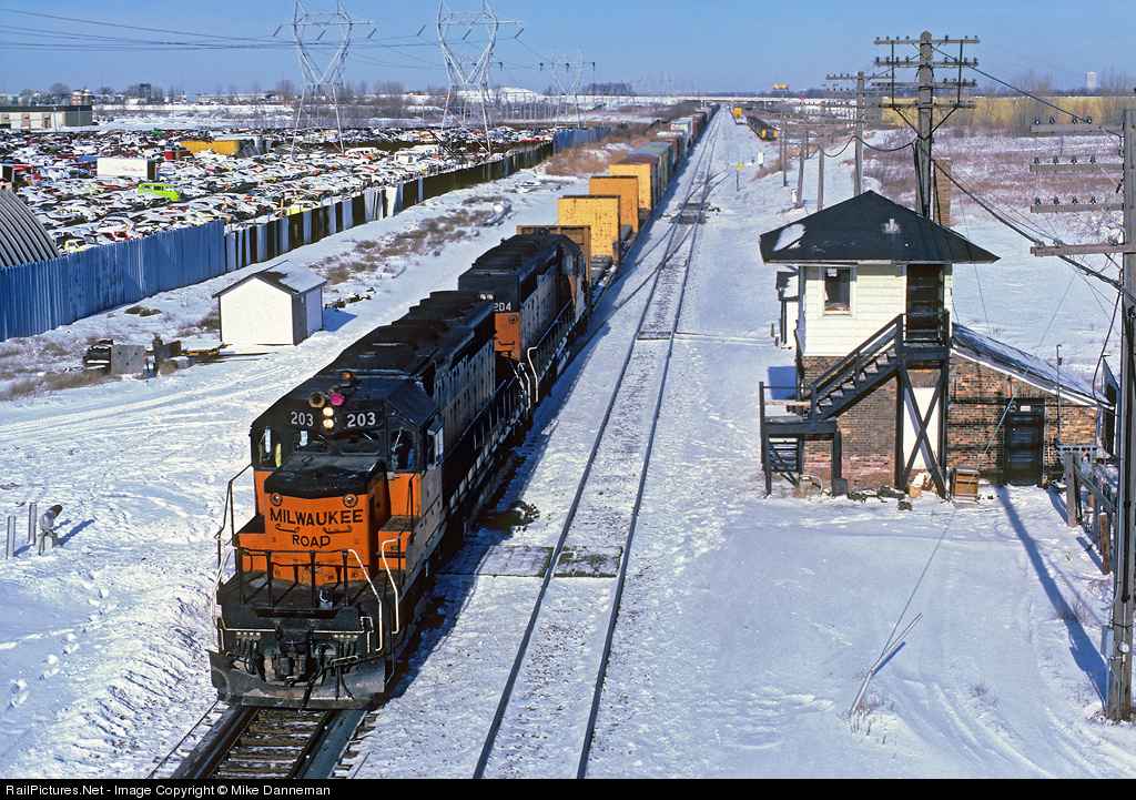 Only a couple of days before Milwaukee Road will disappear forever, a Chicago-bound train passes Lake Tower in Milwaukee, Wisconsin, on December 28, 1985. The view is from the College Avenue bridge. Soon in store for these SD40-2s under Soo Line ownership is lots of black paint covering up the lettering.