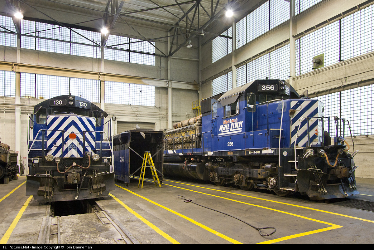 A rebuilt SD45 (MRL calls it a SD45-2XR) sits in Montana Rail Link's Livingston, Montana shop alongside GP9 no. 130. The former Frisco/BN locomotive, which was rebuilt into a SD45-2XR in 1992, is now a parts donor to keep other SDs on the MRL running for years to come.