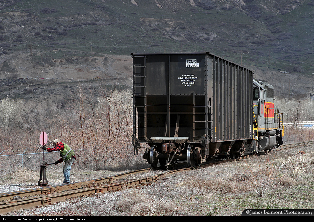 A worker on Utah Railway's RUT211 local lines a switch on the Pacific States Cast Iron Pipe spur at Ironton. The extended height TCMX hopper is loaded with coking coal, utilized in pipe production at the Provo facility.