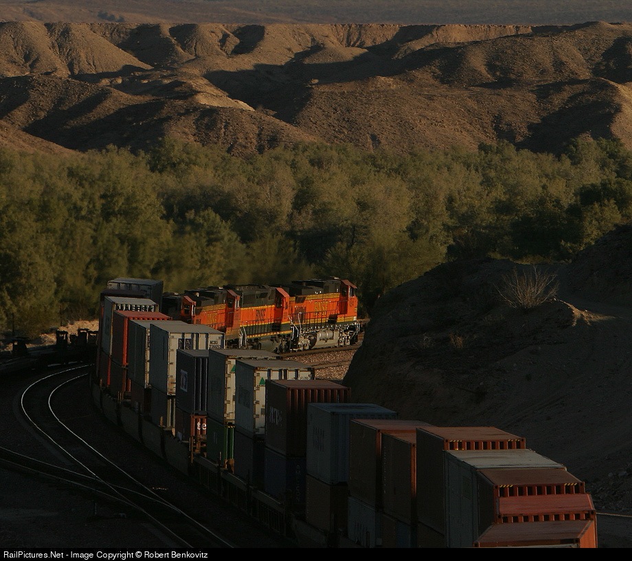 | Four pumpkins lead an early-morning eastbound BNSF stack train through an 'S' curve just east of the Colorado River - most of its train is in a different state and time zone. Canon EOS 10D, 350@f8.0, 190mm |