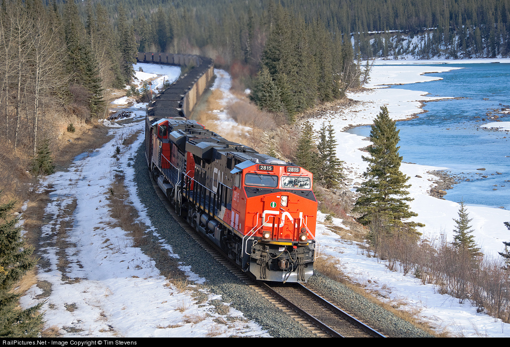 Brand new CN ES44AC 2815 leads a 175 car loaded coal train west along the shores of the Athabasca River.