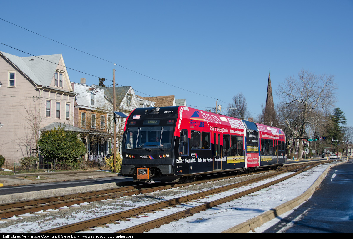 | R.U. Rah! Rah! A RiverLINE trainset is wrapped for the Rutgers University business school, located in Camden near the southern terminus of the line. |