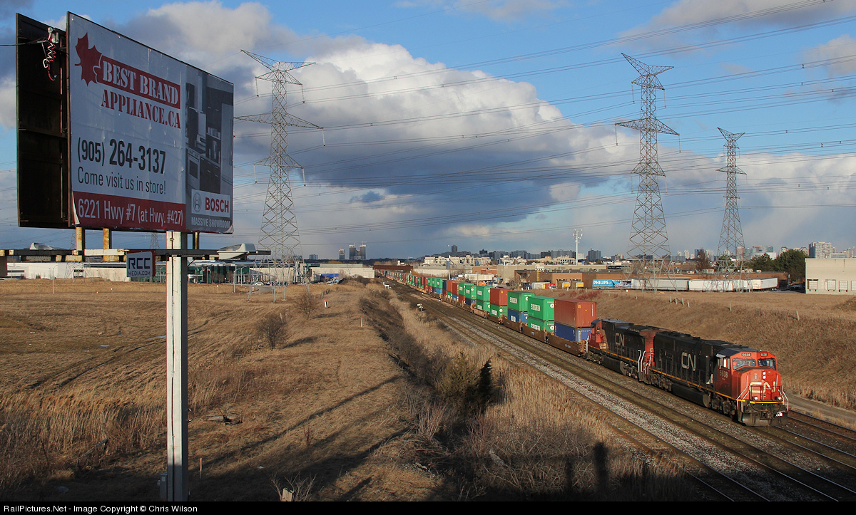 CN Q104 heads towards the intermodal terminal in Toronto with imports. Perhaps a few containers are stuffed full of products for the billboard to the left.