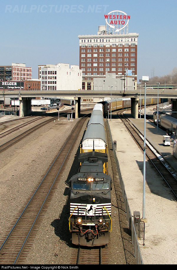 | I lone NS Dash 9 leads a westbound auto rack train across the KCT Main Line at Union Station. To the right you can see Amtrak train 316, the Missouri River Runner, getting ready for a 4 PM departure for St. Louis. |
