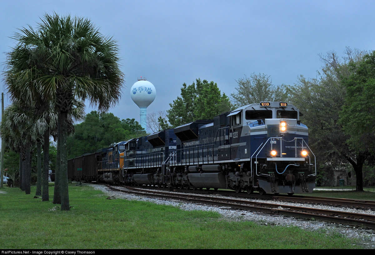 | The "Panthers" watertower and palm trees means this must be Newberry! Near the end of an overcast day, a pair of EMD Ace demos and a CSX Gevo lead N12230 into town, and will soon swap its CSX crew with a Florida Northen crew for the coal train's final miles to the Red Level Junction power plant for unloading. |