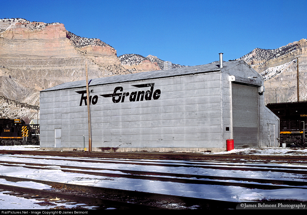 Rio Grande's compact diesel repair shop stands proudly at Helper Yard on New Year's Day, 1988. When the Southern Pacific came to town, management painted over the large flying 'Rio Grande' logo, even though the yard was filled with Rio Grande tunnel motors and SD50s!