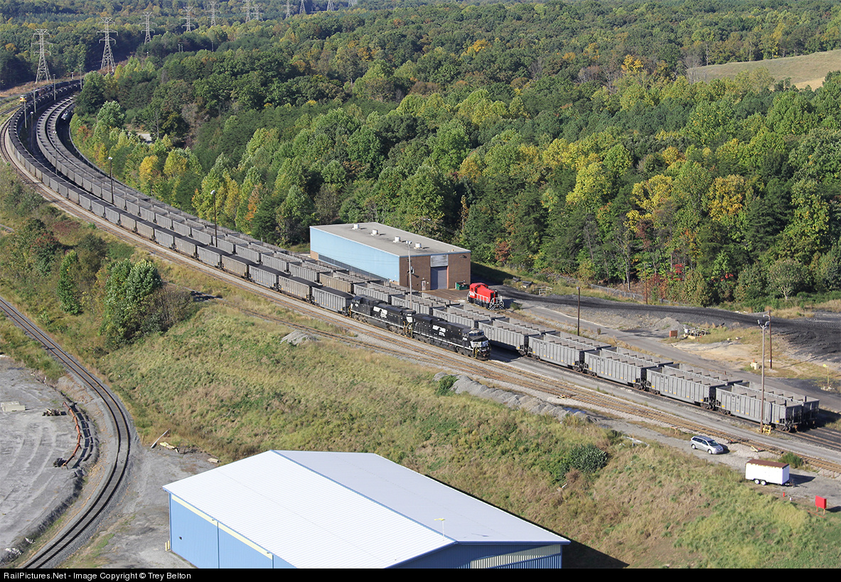 NS 8082 leading the 756 arrives at Belews Creek Steam Station. In the upper left the NS 1074 Lackwanna and the NS 8104 Lehigh Valley can be seen waiting to return the empties to WV. The red switcher seen in the background is manufactured by Republic Locomotive Works with around 600 HP.