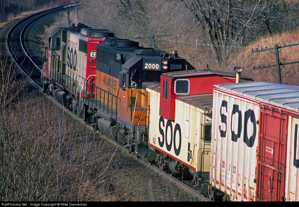Yes, Wisconsin had a helper district. In Soo Line days, trains southbound (and sometimes northbound too) had to contend with Byron Hill, and frequently used helpers. Here, a southbound Soo Line train has a pair of helpers shoving on the rear, consisting of Milwaukee Road GP40 No. 2000 and Soo Line (Lake States) SD39 No. 6241, on March 22, 1987.