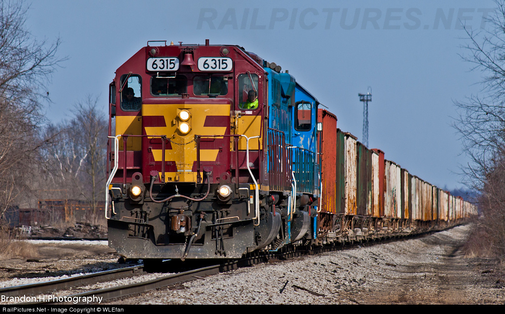| WE 6315 and WE 6348 power a Empty rock train west to Carey, OH. WE 6315 is one of two former Algoma Central SD40-2s on the railroad, also to be noticed in the left side of the photo you can see the Wheeling & Lake Erie's rail train. |