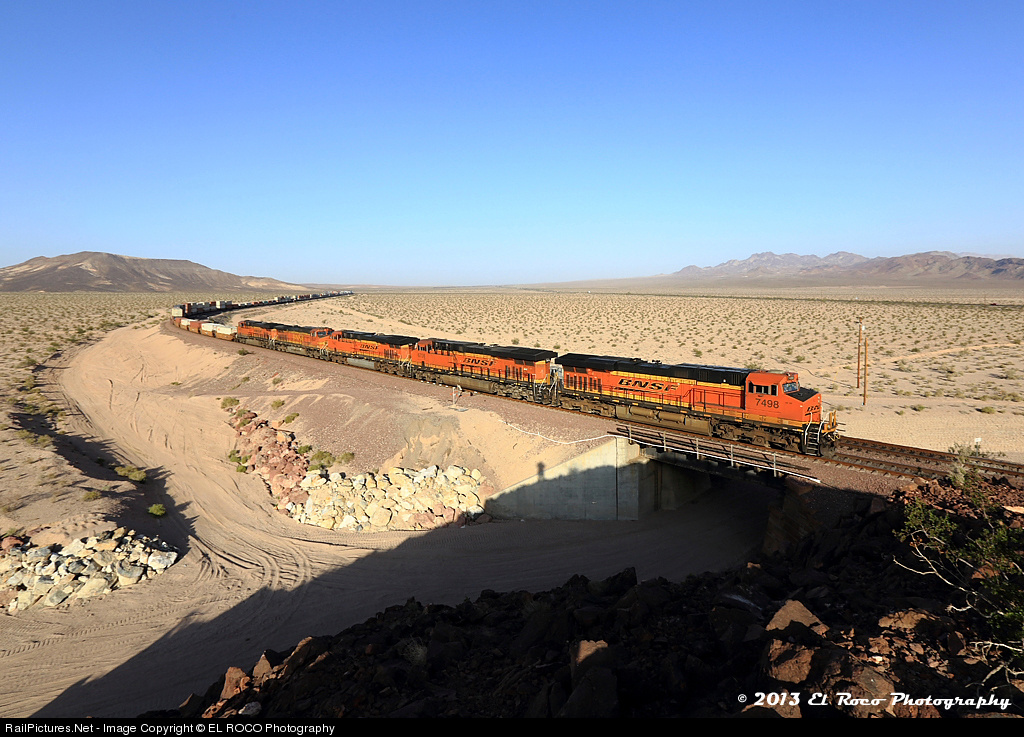 Dawn at the Wash in Ludlow - An eastbound double stack threads the s-turns at Lavic and approaches Ludlow California as the sun comes up over the Mojave. The direction of the head end units evidences that these are not members of the Barstow Pool and are transitory in nature.