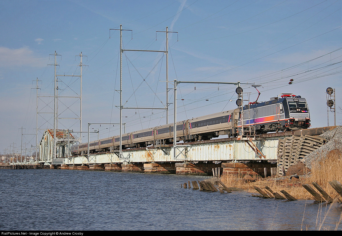 A Bombardier electric locomotive leads a set of passenger cars across the Raritan Bay into South Amboy on the North Jersey Coast Line.