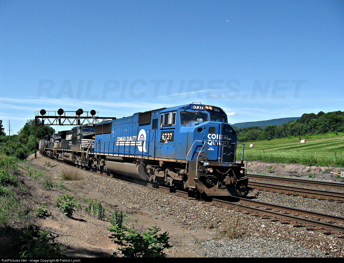 | NS SD60I 6737 (still in Conrail paint) leads two other NS GEs on loaded coal train 502 past a private crossing in Tipton, PA. This train is on it's way out of Altoona after conquering the Alleghenies. |