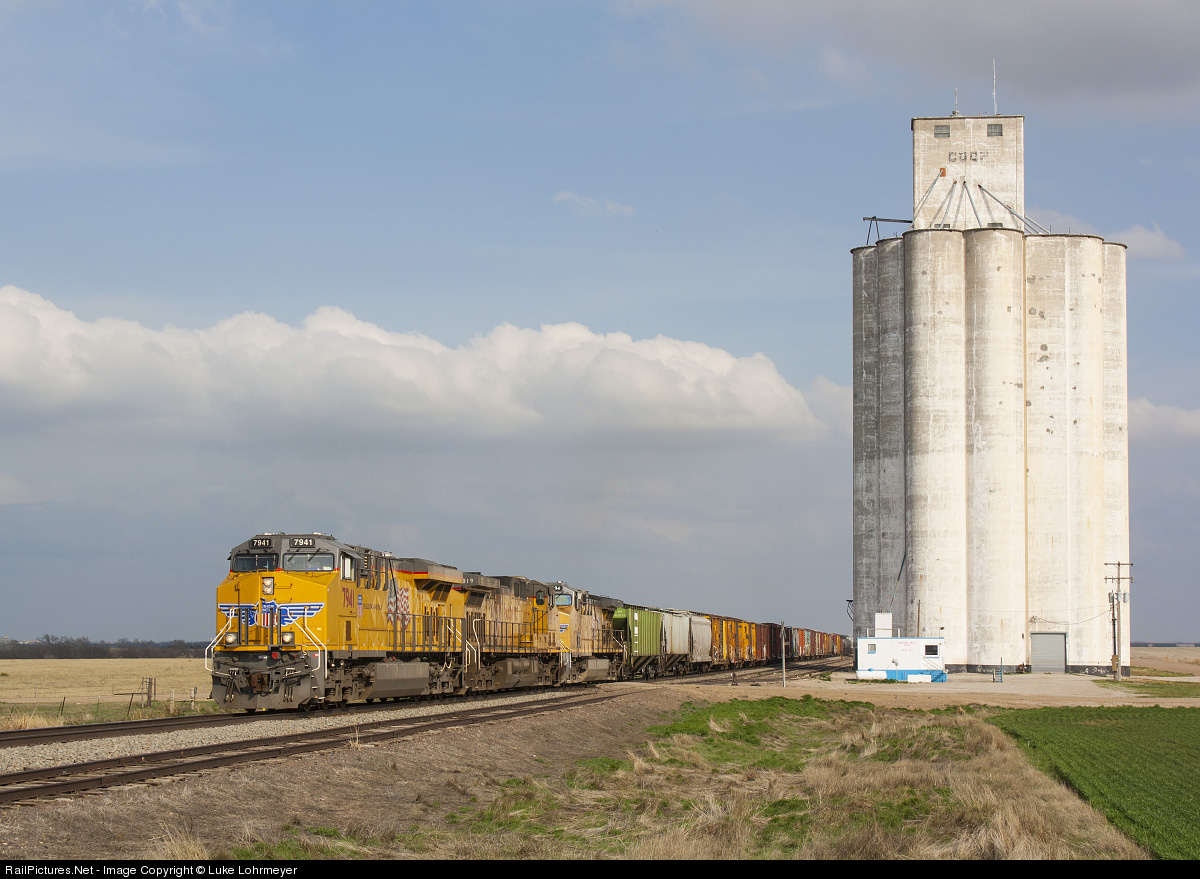 UP 7941 leads a 9,000 ton Manifest from Salina, Kansas to Denver, Colorado upgrade past the Riga, Kansas elevator. Riga is one of the cathedrals on the plains, featuring the UP, the elevator, and Old Highway 40...no houses, no town, just an elevator and an old UP siding.