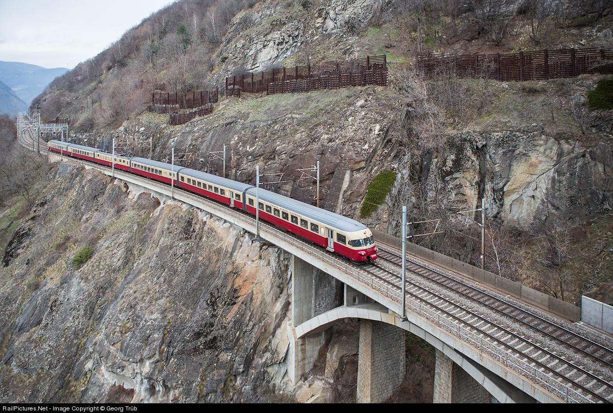 | RAe TEE II trainset # 1053 of SBB Historic on a round trip over Lötschberg mountain line is crossing Mundbach viaduct between Lalden and Brig. The timeless elegance of this 1961 built train is remarkable. |